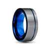 This 8mm ring is an irresistible combination of sleek and stunning black tungsten carbide in a complimenting blue grooved finish and inner band for a comfortable fit.